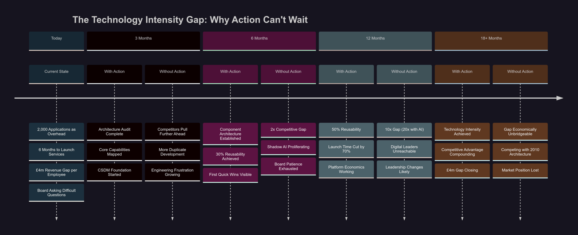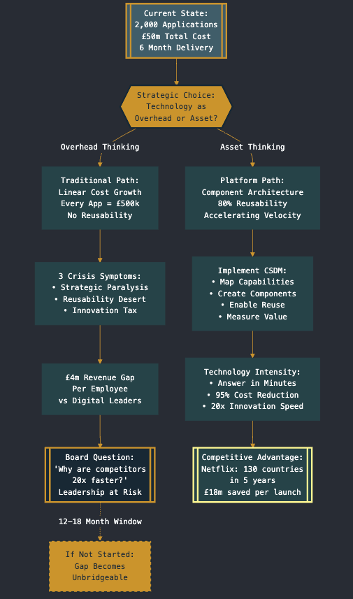 The Framing: "We face an architectural choice that determines competitive position. Current state: 2,000 applications managed as overhead. Target state: digital platform with 2,000 components as intellectual property. The gap costs us £4 million per employee in revenue versus digital leaders. The window to transform is 12-18 months."