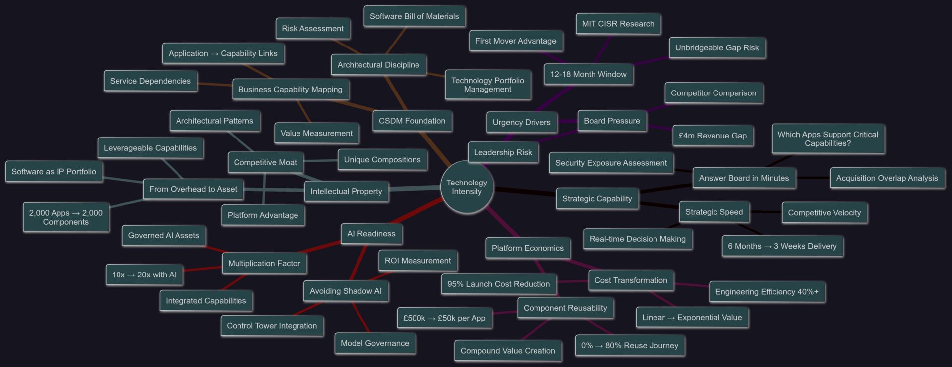 This isn't about having more technology. Every enterprise has plenty of that. This is about Technology Intensity—the recognition that your applications aren't overhead to be managed; they're intellectual property to be leveraged. And the difference between these two perspectives? It's architectural.