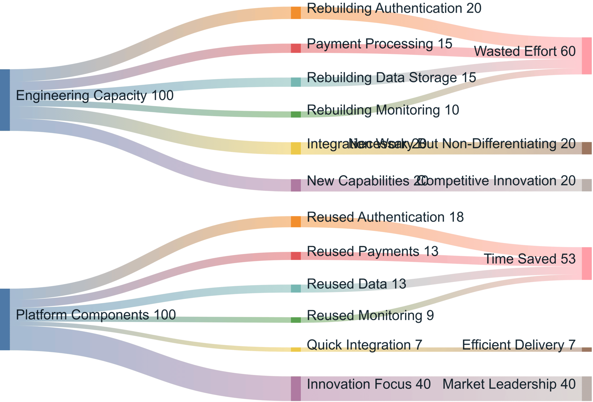 When Spotify rebuilt their platform architecture in 2016, they started by mapping their 200+ services to core business capabilities. This revealed that 40% of their engineering effort went to capabilities that delivered no competitive differentiation—authentication, data storage, logging, monitoring. By consolidating these into reusable platform components, they freed 40% of engineering capacity for competitive innovation. (Source: Spotify Engineering Culture, 2016)